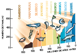 A lo largo de los últimos 600 millones de años, la vida ha ido haciéndose progresivamente más diversa, aunque no sin sufrir épocas de retrocesos temporales y episodios de "extinciones en masa". Hoy en día, gracias a los estudios paleontológicos, se conocen cinco de estos episodios, que se aprecian en el gráfico por la caída brusca del número de familias existente.