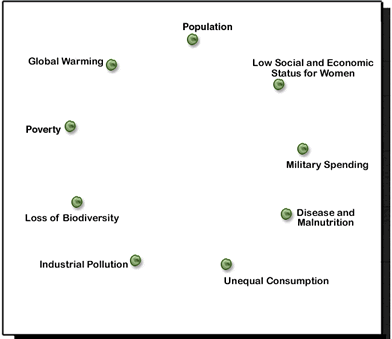 Las siguientes tareas proporcionan una oportunidad para que examine las relaciones entre muchos de los problemas sociales, económicos y ambientales más importantes que enfrenta la gente en el mundo actual. Algunas de estas realidades globales se muestran en el siguiente diagrama. Imprima una copia del diagrama, ya que usará lápiz y papel en esta actividad. |