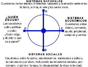 | | En los módulos 1, 2 se introdujeron muchas ideas sobre la naturaleza y el significado del desarrollo sostenible, incluyendo la necesidad de ir más allá de la conservación de la naturaleza (sostenibilidad ecológica), para comprender también la sostenibilidad cultural, social, económica y política. Esta actividad sintetiza esas ideas dentro de una visión de los valores y los principios que pueden ayudar a construir un futuro sostenible. Esta visión holística del “medio ambiente” es un reflejo de lo que se llama “sistemas de pensamiento”, una manera de pensar que considera todos los aspectos del mundo interrelacionados a través de patrones de sistemas interdependientes, que incluyen los sistemas natural, social, económico y político.  Pinche para visualizar la imagen completa. Esto significa que una visión holística del “medio ambiente” comprende: | Sistemas naturales que proporcionan recursos como el aire, el agua, la tierra, los alimentos, etc., que mantienen todas las formas de vida, humana y no humana. | | Sistemas sociales y culturales que proporcionan apoyo familiar, comunitario y social para que las personas vivan juntas de una manera culturalmente apropiada. | | Sistemas económicos que proveen los medios de subsistencia (empleos e ingresos) para las personas. | | Sistemas políticos a través de los cuales el poder social se ejerce para llevar a cabo políticas y decisiones sobre la manera en que los sistemas sociales y económicos usan los recursos del ambiente natural. | |