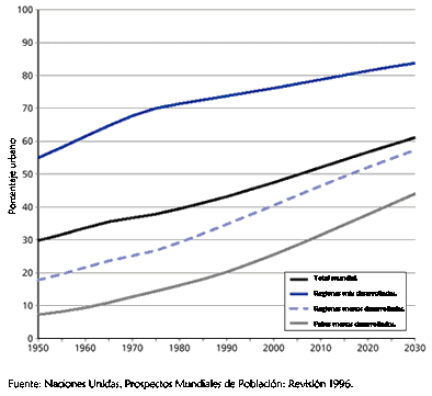 La tendencia global hacia la urbanización La movilización de la gente a las ciudades ha aumentado en los últimos 40 años, sobre todo en las regiones con menos desarrollo, y la parte de la población mundial que vive en áreas urbanas se ha incrementado de un tercio en 1960 a un 47% (2.8 mil millones de personas) en 1999. Actualmente, la población urbana mundial está aumentando en unos 60 millones de habitantes al año, lo cual es tres veces más de lo que ocurre en el caso de la población rural. La urbanización creciente es resultado de la natalidad en áreas urbanas y del movimiento continuo de los habitantes que abandonan su ambiente rural. Estas fuerzas también están fomentando el crecimiento desmesurado de las áreas urbanas, pues los terrenos que antes eran asentamientos rurales y periurbanos se han incorporado a las ciudades cercanas y las que eran ciudades secundarias, ligadas por el comercio a centros urbanos más grandes, han aumentado su tamaño. El número de personas que viven en ciudades en los países en vías de desarrollo casi se ha duplicado desde 1960 (ha pasado de menos de un 22% a más de un 40%), mientras que en las regiones más desarrolladas, la porción urbana ha aumentado de un 61% a un 76%. Hay una importante relación entre este movimiento poblacional de las áreas rurales a las urbanas y la disminución en el tamaño promedio de las familias. Asia y África siguen siendo las regiones en vías de desarrollo menos urbanizadas (menos de 38% cada uno). Las regiones de América Latina y el Caribe son más de un 75% urbanas, un nivel casi igual a los porcentajes de Europa, América del Norte y Japón (todos están entre el 75 y el 79%). Se espera que la urbanización continúe hasta bien entrado el próximo siglo. Para el año 2030 se especula que aproximadamente 5 mil millones (61%) de los 8.1 mil millones de habitantes del mundo vivan en ciudades. Las regiones menos desarrolladas serán urbanas en más de un 57%. Es más, América Latina y el Caribe tendrán un porcentaje superior de habitantes en las ciudades que Europa. Tendencias en la urbanización mundial 1950-2030
