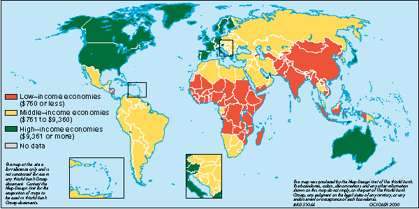 Gross national product (GNP) per capita is the dollar value of a countrys final output of goods and services in a year, divided by its population. It reflects the average income of a countrys citizens. Countries with low GNP per capita tend to be located in Sub-Saharan Africa and parts of Asia. Countries with high GNP per capita tend to be located in Europe, North America and parts of Asia. |