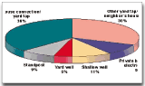 1. Which of the sources of water shown in Chart 3 bring water directly to a persons home or yard? [house connection, yard tap, yard well] What percentage of the people get their water from these sources? [about 41%] Which sources of water require people to leave their homes or yards to get water? [standpost, shallow well, private borehole with electric pump, other yard tap or neighbors house] What total percentage of the people get their water from these sources? [59%]