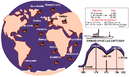 En el mundo más de 200 millones de personas dependen de la pesca e industrias anexas como modo de subsistencia. Esta dependencia de nuestra sociedad con la pesca ha supuesto también conflictos diplomáticos diversos por el hecho de que muchos países han reclamado el límite de la jurisdicción de las aguas marinas a 200 millas. Actualmente, son unas 120 las naciones que las ostentan. Esto ha provocado que algunos países con una importante flota pesquera vieran amenazada su actividad. Por su parte, los países con caladeros importantes defienden su posesión. Este sería el caso de España que cuenta con una importante flota y Canadá en cuyas aguas se encuentran algunos de los caladeros más productivos. La llamada guerra del fletán fue una acción defensiva canadiense para frenar el agotamiento de los recursos pesqueros de sus aguas territoriales. La reducción de la flota pesquera afecta a todos los países del mundo. En el Estado Español, por ejemplo, en los últimos años se ha reducido en un 25% la flota pesquera y ha puesto en el paro a una gran cantidad de personas. Sin embargo, nuestro país, que es un gran comedor de pescado, ha compensado este déficit propiciando las importaciones desde otros mercados internacionales; en términos absolutos, el consumo de pescado en España ha ido en aumento alcanzando las 834.000 toneladas en 1993. El resultado ha sido la pérdida de la tradicional estabilidad del precio del pescado que conservaba nuestro país y ha acrecentado la pérdida de competitividad de nuestro sector pesquero que faena en el litoral. |